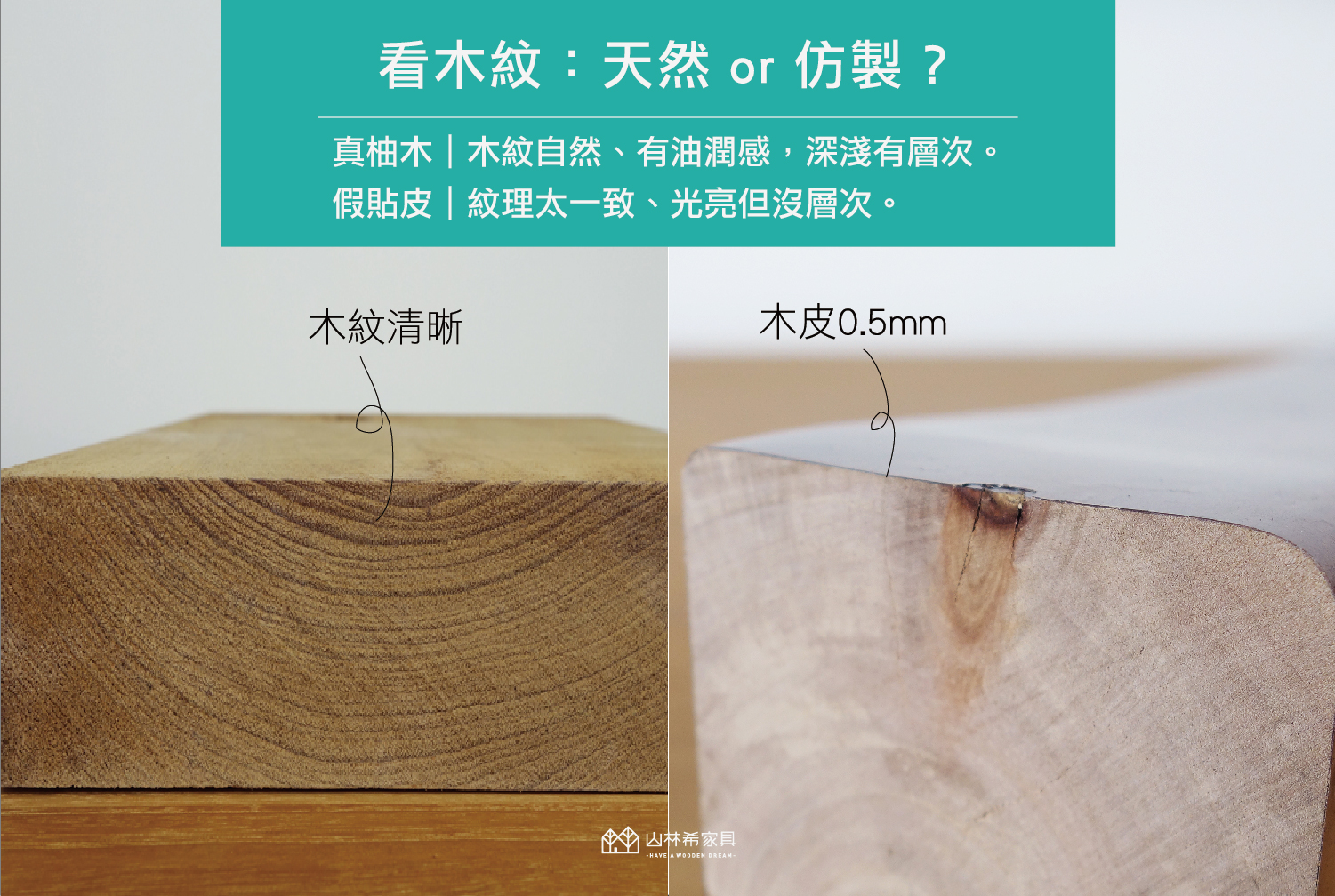 真正柚木的木紋自然流暢、有油潤感,深淺有層次。